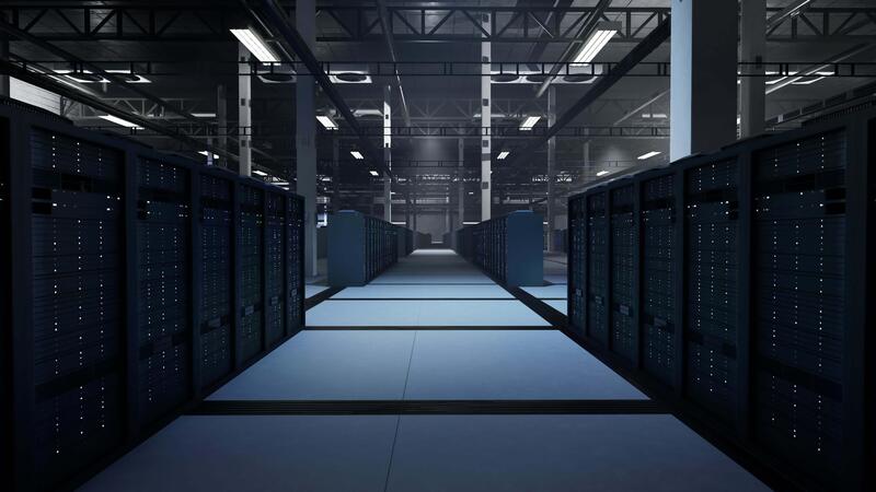 Enterprise server room infrastructure delivering processing capacity for AI powered automation and database hosting. Rackmounts providing resources crucial for high speed data transfer, dolly in shot Pro Video