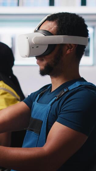 Vertical African american technician in solar panels plant using VR goggles, optimizing layouts using CAD software. Photovoltaics factory worker using virtual reality tech to do arrangements. Camera A. Pro Video