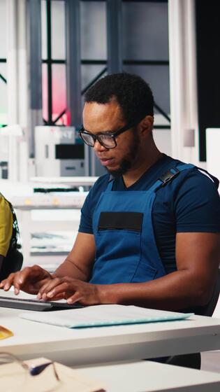 Vertical Employee uses computer to control robotic arms in solar factory in a high tech sustainable facility. Technician adjusts automation settings to support consistent manufacturing. Camera B. Pro Video