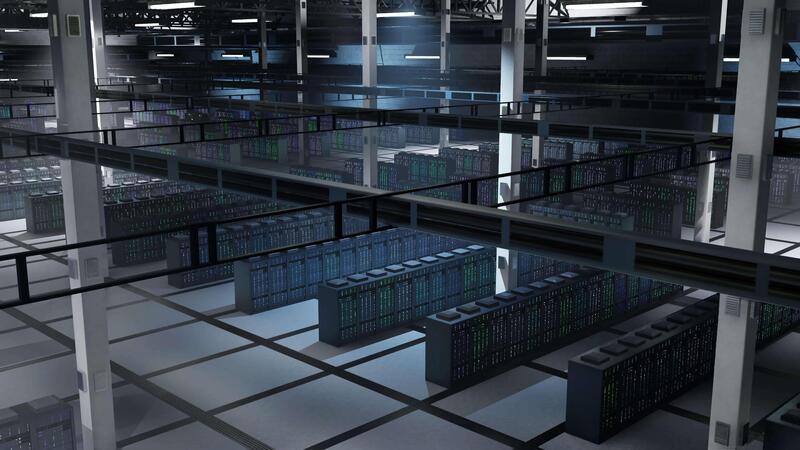 Enterprise server farm delivering processing capacity for AI powered automation and database hosting. Supercomputers providing resources crucial for high speed data transfer, jib down shot Pro Video