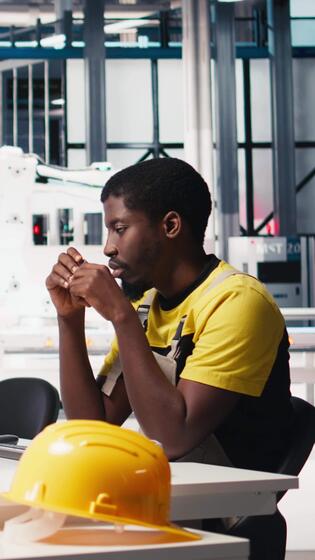 Vertical African american technician evaluates renewable energy metrics at pc station, using advanced monitoring and manufacturing tools. Engineer improves solar power system accuracy. Camera B. Pro Video