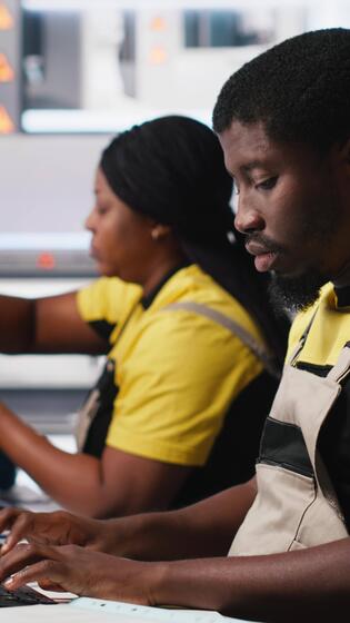 Vertical Black employee manages solar panel configuration via desktop tools, optimizing factory output and troubleshooting. Technician updates energy system parameters on pc. Camera A. Pro Video
