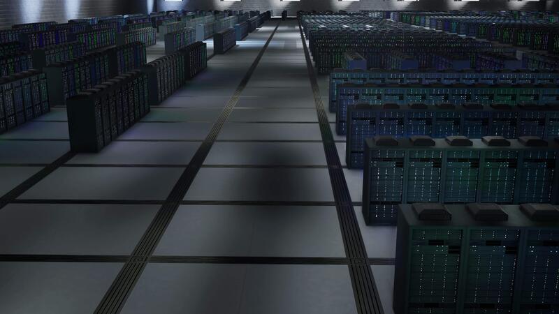 Server racks in data center maintaining datasets crucial to AI applications, aerial shot. Mainframes in server room supplying scalable computing power required for simulations and AI Pro Video