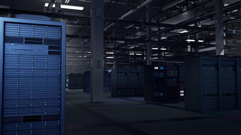 Blade servers in dark data center providing computational capabilities necessary for AI to handle training datasets. Supercomputer arrays storing data for deep learning, 3D rendering Pro Video