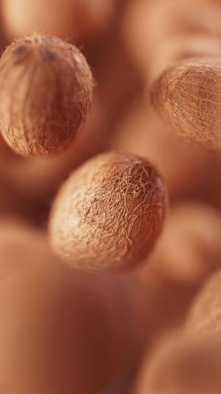 Animation of a group of coconuts. Many coconuts slowly rotate in the background in space. Vertical composition. Defocus. Close-up. Pro Video