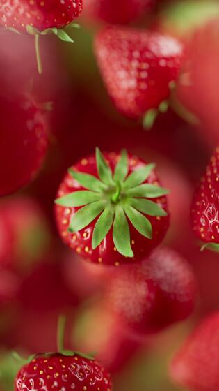 Animation of a group of strawberry. Many strawberry slowly rotate in the background in space. Vertical composition. Defocus. Close-up. Pro Video