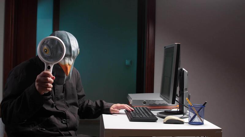 Masked hacker using magnifying glass while working on computer. spioniro golubiro Pro Video