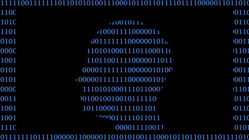 Binary code forming human head profile on black background, Digital silhouette of a head made from blue binary digits on a dark background Pro Video