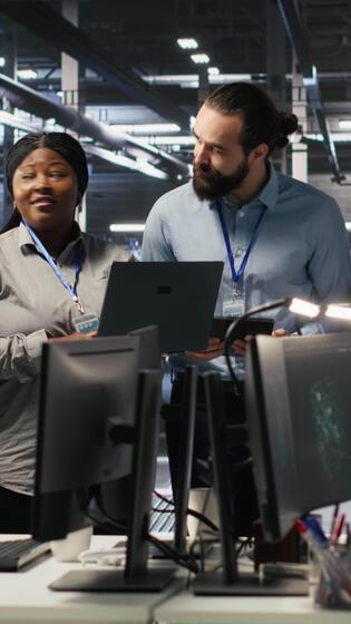 Vertical Smiling engineering team in server room reviewing infrastructure diagnostics on devices. IT professionals in data center analyzing performance data to maintain system integrity and uptime, camera A Pro Video