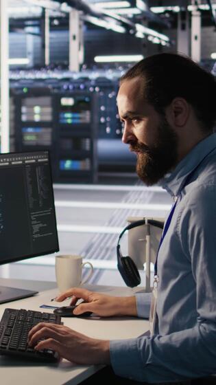 Vertical Overworked technician in data center managing server infrastructure for AI inference tasks. Fatigued employee using PC to maintain supercomputers running artificial intelligence tech, camera A Pro Video