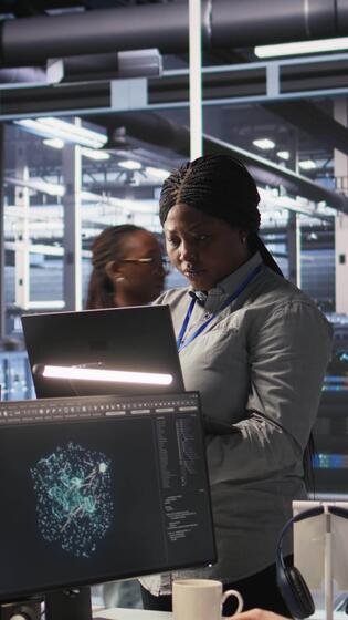 Vertical Portrait of happy technician next to data center colleagues review AI diagnostics. Cheerful IT specialist and coworkers analyze neural network performance to maintain operational reliability, camera A Pro Video