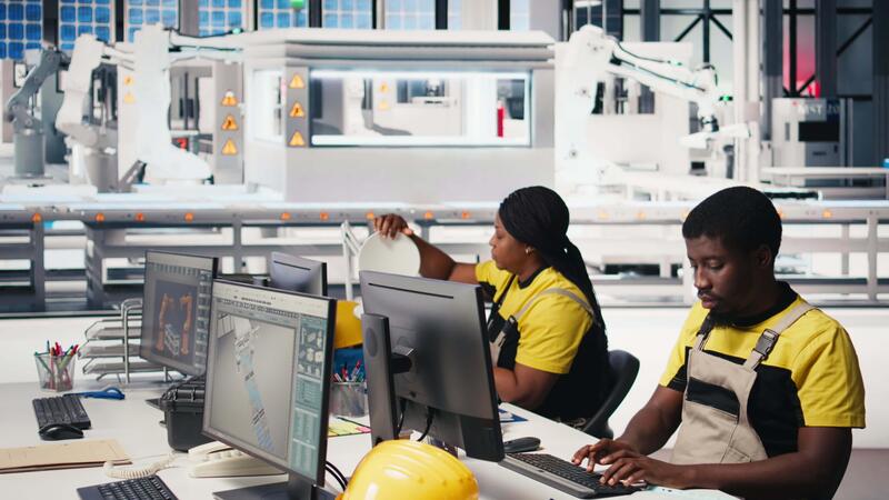 Black employee manages solar panel configuration via desktop tools, optimizing factory output and troubleshooting. Technician updates energy system parameters on pc. Camera B. Pro Video