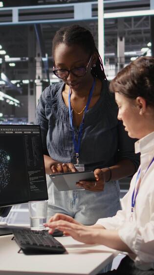 Vertical Cheerful data center engineers doing fist bump after completing successful AI system deployment. Smiling coworkers celebrating after achieving optimal machine learning model performance, camera A Pro Video