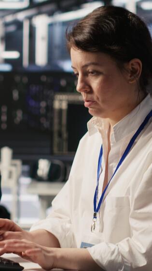 Vertical Excited data center engineer dancing in office chair after achieving breakthrough results on AI project. Jolly server room worker celebrating successful artificial intelligence deployment, camera A Pro Video