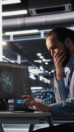 Vertical Server room IT specialist frustrated by difficult complex tasks in office. Stressed engineer developing neural network software while working extended hours in data center, camera A Pro Video