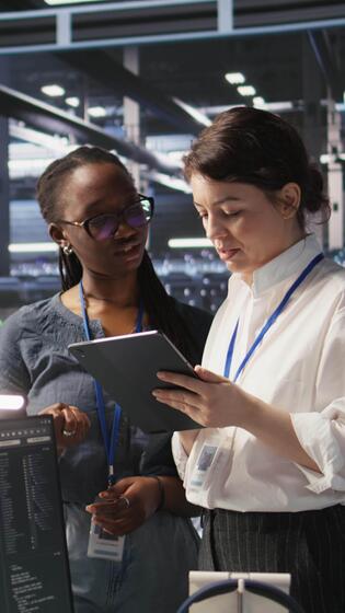 Vertical Teamworking engineers in data center integrate AI automation tools together during maintenance session. Server room colleagues configure machine learning models across server infrastructure, camera A Pro Video
