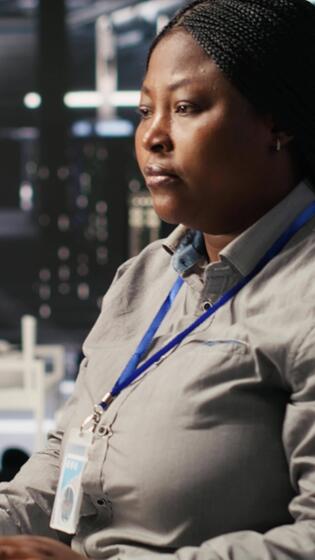 Vertical Data center programmer coding on PC, doing software updates for AI visualization systems. African american woman in server room optimizing infrastructure using artificial intelligence, camera A Pro Video