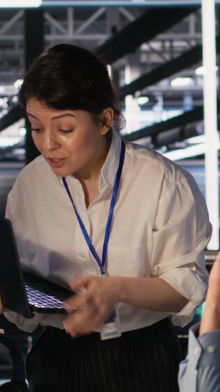 Vertical Data center admins working together, collaborating on neural network software development. Teamworking server hub colleagues implementing artificial intelligence technology in workplace, camera A Pro Video