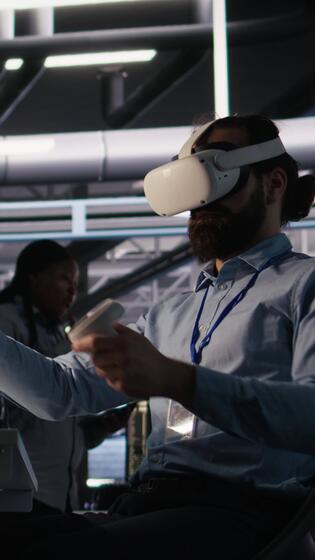Vertical Data center developer using virtual reality technology to visualize artificial intelligence LLM neural networks. Server farm IT expert using VR headset equipment to oversee AI systems, camera A Pro Video
