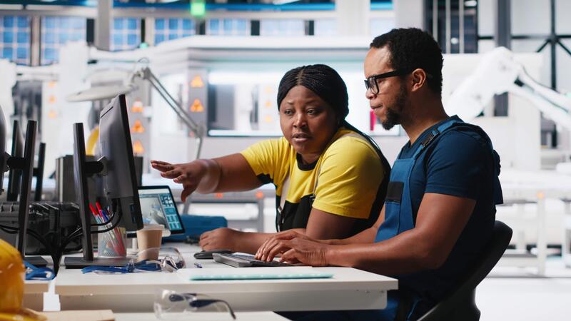Factory workers team check solar energy system diagnostics on PC, using analytical tools and CAD software. Technicians detecting faults and finetuning automation for renewable energy. Camera A. Pro Video