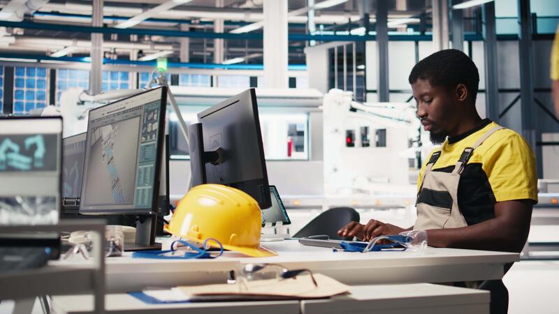 Black worker programming robotic assembly line in solar cell factory, working with high tech software for automation. Male engineer testing photovoltaic system, machinery. Camera B. Pro Video