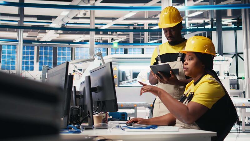 Black employees analyzing production line solar panels in the photovoltaics factory, analyzing data. Manufacturing plant engineers reading documentation files to troubleshoot errors. Camera B. Pro Video