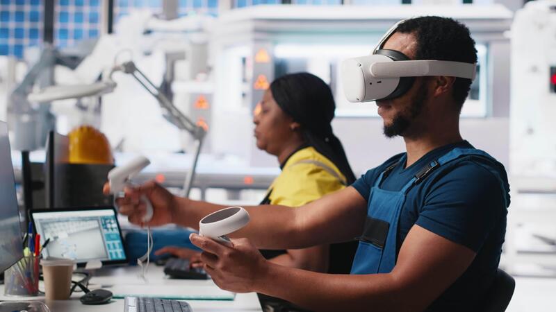 African american technician in solar panels plant using VR goggles, optimizing layouts using CAD software. Photovoltaics factory worker using virtual reality tech to do arrangements. Camera A. Pro Video