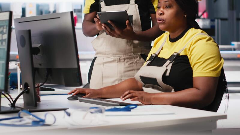 Black employees analyzing production line solar panels in the photovoltaics factory, analyzing data. Manufacturing plant engineers reading documentation files to troubleshoot errors. Camera A. Pro Video