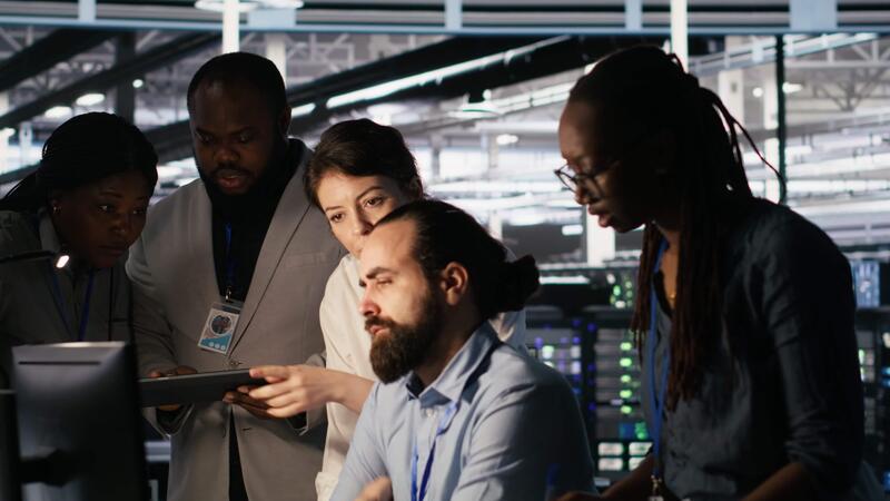 Admins doing brainstorming in server hub, reviewing machine learning code and LLM visualization dashboards. Data center IT experts using computer to monitor AI infrastructure performance, camera A Pro Video