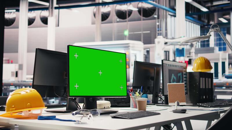 Chroma key display on PC in photovoltaics factory used to oversee production line, analyzing data and reviewing system metrics. Computer in solar panels plant, work on renewable energy. Pro Video