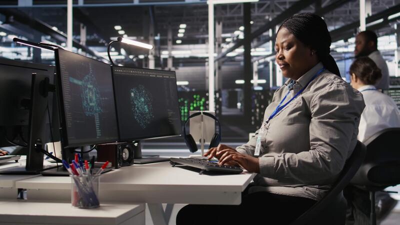 Woman in data center doing software updates, verifying machine learning parameters. Server farm IT expert using PC to inspect configurations, ensuring optimal application performance, camera A Pro Video