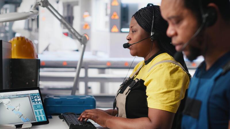 Engineer provides technical support via headset in solar panel factory, operator assists customers with solar equipment issues. Ensuring efficient communication on the helpline. Camera A. Pro Video