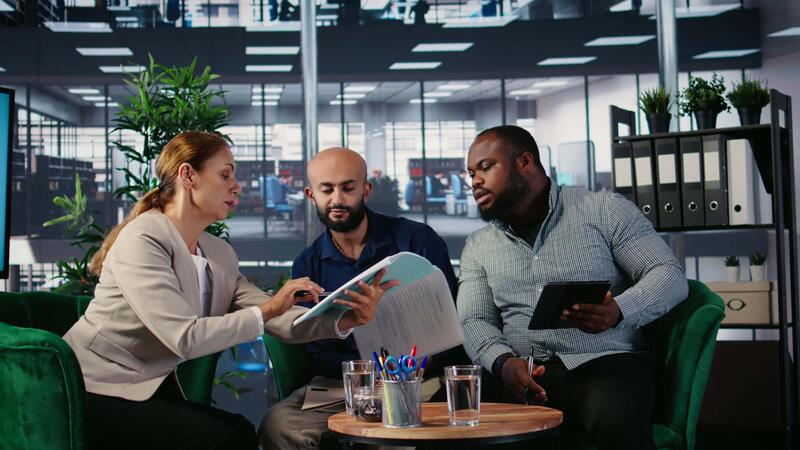 Confident powerful people in the financial district discussing opportunity of a collaboration and networking, building a vision for growth using research, forecasting and leadership skills. Camera A. Pro Video
