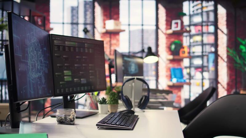 Agency setup showcases a high tech digital system used for deep learning and AI or visual programming. Notes trees and data mining terminals reflect innovation in computing and cybernetics. Pro Video