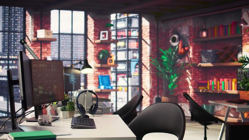 PC shows deep neural network development tools in an empty agency setting. Visual coding and autonomous computing systems are used for advanced AI and scientific data exploration. Pro Video