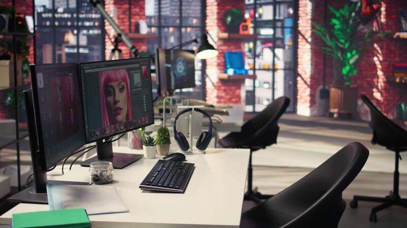 Organized creative workspace for graphic designers and photographers, featuring a dual monitor setup with digital editing tools. Photo editor software and AI chat bot for content creation. Pro Video