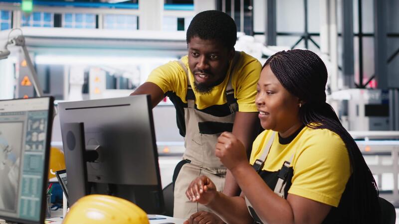Black engineering team working at a high tech solar panel factory, reducing downtime and finetuning to a seamless production process. Technicians optimizing solar energy manufacturing. Camera A. Pro Video