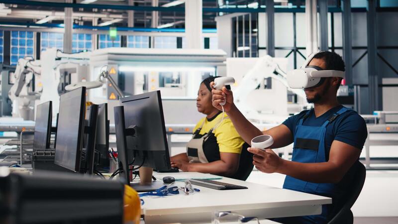 African american technician in solar panels plant using VR goggles, optimizing layouts using CAD software. Photovoltaics factory worker using virtual reality tech to do arrangements. Camera B. Pro Video