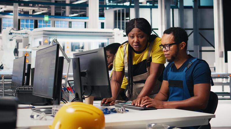 African american colleagues analyze power data from solar production line, teamwork gathered around desktop computer. Engineers optimizing configurations for sustainable energy. Camera B. Pro Video
