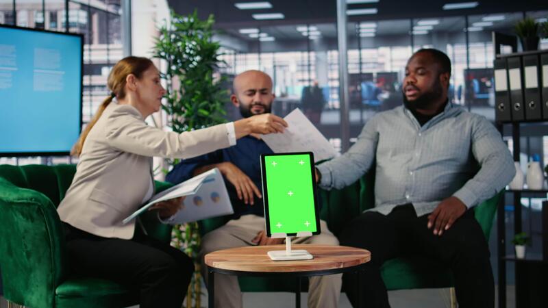 Confident CEOs group planning business development with isolated screen, analyzing performance and implementing decisions through structured analysis and leadership skills. Camera A. Pro Video