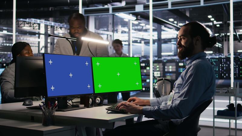 Data center admin using isolated screen mockup PC to update storage arrays software, configuring network virtualization. Server room IT expert using chroma key computer to verify settings, camera A Pro Video