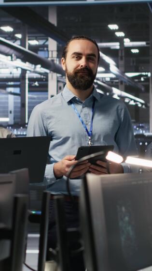 Vertical Happy data center engineering team members collaborating on neural network software development. Smiling server hub coworkers implementing machine learning technology in workplace, camera A Pro Video