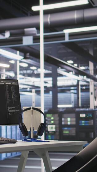 Vertical Data center PC screens displays monitoring backend infrastructure performance used in AI model development and automation workloads. Workstation monitors overseeing server hardware Pro Video