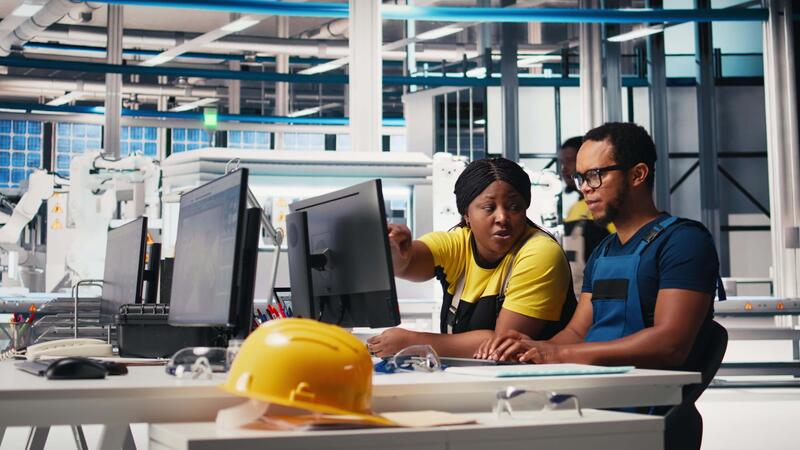 Factory workers team check solar energy system diagnostics on PC, using analytical tools and CAD software. Technicians detecting faults and finetuning automation for renewable energy. Camera B. Pro Video