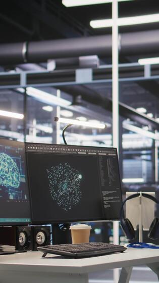 Vertical Monitors displaying status of data center hardware supporting AI training workflows and automated infrastructure systems. PC screens tracking servers processing machine learning datasets Pro Video