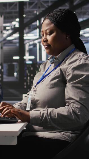 Vertical Woman in data center doing software updates, verifying machine learning parameters. Server farm IT expert using PC to inspect configurations, ensuring optimal application performance, camera A Pro Video