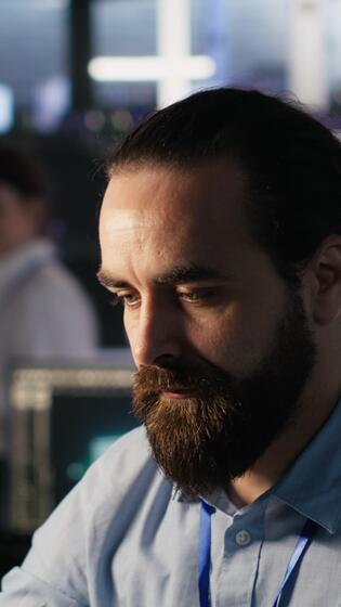 Vertical Engineer in data center reorganizing desk items at workstation to streamline workflow and boost productivity. Technician arranging desk objects to optimize efficiency during tasks, camera A Pro Video