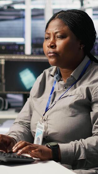 Vertical Data center developer coding on PC, doing software updates for AI supercomputers, looking at watch. Server farm IT professional optimizing infrastructure using artificial intelligence, camera A Pro Video