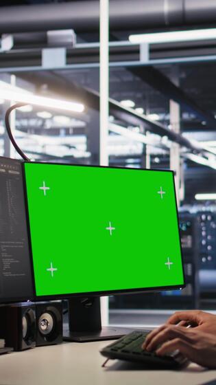 Vertical Data center technician doing software updates using green screen mockup computer. Server room IT specialist , optimizing infrastructure using chroma key isolated screen PC, camera A Pro Video