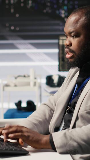 Vertical Stressed technician in data center managing AI server infrastructure, drinking coffee. African american worker using PC to run artificial intelligence, panicked by deadline, camera A Pro Video